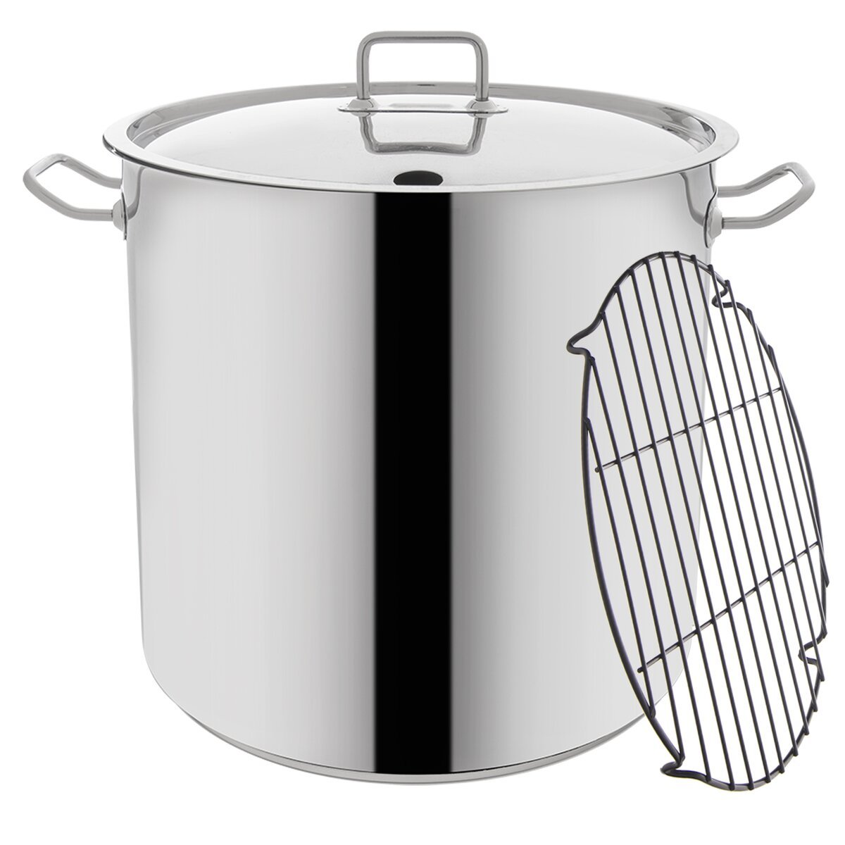 Hrnec s nerezovou poklicí s otvorem pro teploměr využijete jak na klasické vaření velkých porcí, tak na zavařování. Součástí výrobku je mřížka, která se při zavařování umístí na dno hrnce a chrání sklenice před prasknutím v průběhu procesu zaváření. Lze umístit 12 sklenic Omnia 0,7 l do spodní řady a dalších 12 těchto sklenic do další řady. Materiál: nerezová ocel třídy 304. Sendvičové dno. Rozměry: objem 32 l, pr. 36 cm, v. 35,5/41 cm. Nerezové hrnce a kastroly představují díky používaným technologiím a kvalitním materiálům výrobek vhodný pro každou moderní domácnost a jsou ideální cestou ke zdravé výživě, dietní, ekonomické a estetické přípravě pokrmů. Nabízené nádoby jsou vyrobeny z vysoce kvalitní nerezové oceli. Naakumulovaná energie předává teplo dále do nádoby - tepelný zdroj vypínáme v předstihu. Nádobí lze používat na všechny typy spotřebičů i do trouby. Vhodné i do myčky nádobí. - fritování, napařování, vaření s minimálním množstvím tuku, bez ztráty vitamínů a minerálů obsažených v potravinách - nádobí představuje dokonale hygienické prostředí pro vaření a uchování potravin - zachování přirozené chuti a hmotnosti upravovaných potravin - vnější a vnitřní povrch nádob je vysoce leštěný, takže brání usazování nečistot a zaručuje dokonalou údržbu - sendvičové dno s termoakumulačními vlastnostmi zaručuje rychlé a ekonomické vaření s výraznou úsporou energie - široká nabídka kastrolů, hrnců a rendlíku Vám umožňuje vytvořit si soupravu nádobí podle vlastních představ.