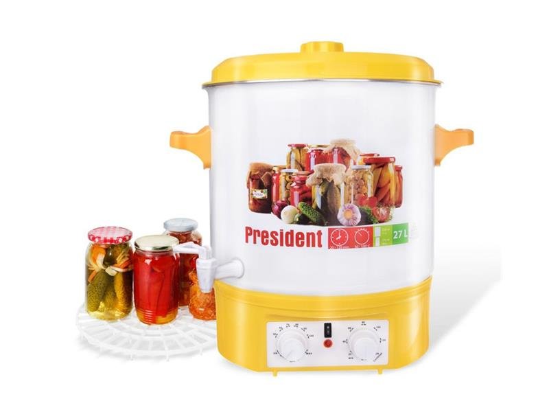 Univerzální zavařovací hrnec - objem 27 l, hygienický smaltovaný - snadno čistitelný. Pro zavařování např. 11 sklenic 0,75 l nebo 34 sklenic 0,37 l. Plynule nastavitelný termostat od 50 - 100 °C, plynule nastavitelný časovač od 20 - 120 minut. Plastové víko, skrytý topný článek, vestavěný výtokový kohout v boku hrnce. Ochrana proti vyvaření i přehřátí, světelná signalizace zapnutí, tepelně izolované rukojeti, součástí zavařovací rošt. Lze použít i pro ohřev a stáčení čaje, svařeného vína a jiných horkých nápojů. Příkon 1800 W. Napájení 220 - 240 V. Rozměry: v. 29 cm, pr. 37 cm (včetně okraje), š. včetně držadel 46 cm.