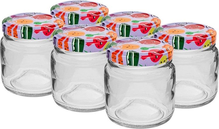 Sada 6 sklenic o objemu 106 ml s barevnými víčky bude vypadat skvěle v každé domácí kuchyni. Zavařovací sklenice s ozdobným barevným víčkem - ideální pro domácí pochutiny z vašeho oblíbeného ovoce, přímo ze sadu a zahrady. Elegantní tvar a barevné víčko zdůrazňují chuť a bohatost obsahu každé plné sklenice. Odolné šroubovatelné uzávěry z pozinkované oceli, s vnitřní silikonovou vrstvou. Rozměry - výška 6,2 cm, průměr 5,7 cm.