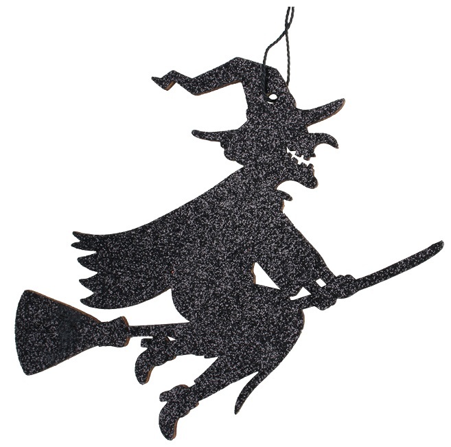 Čarodějka dřevěná s glitrem na zavěšení 14 x 11.5 cm