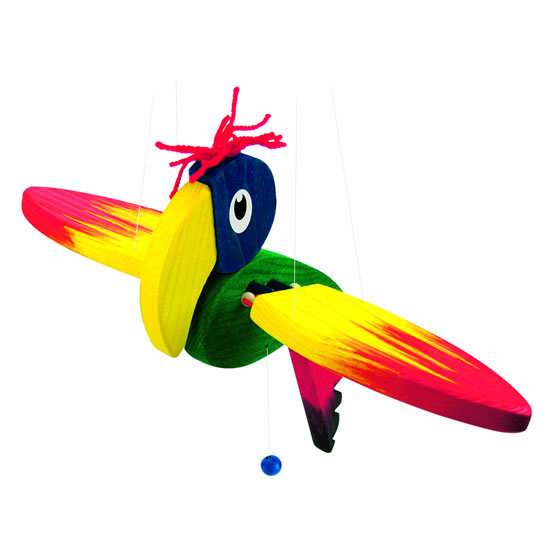 Papoušek na zavěšení. Oživí každý dětský koutek, po zatažení za šňůrku se pohybuje. Rozměry: 30 cm. Parametry a specifikace Doporučený věk od: 3 let Materiál:dřevo
