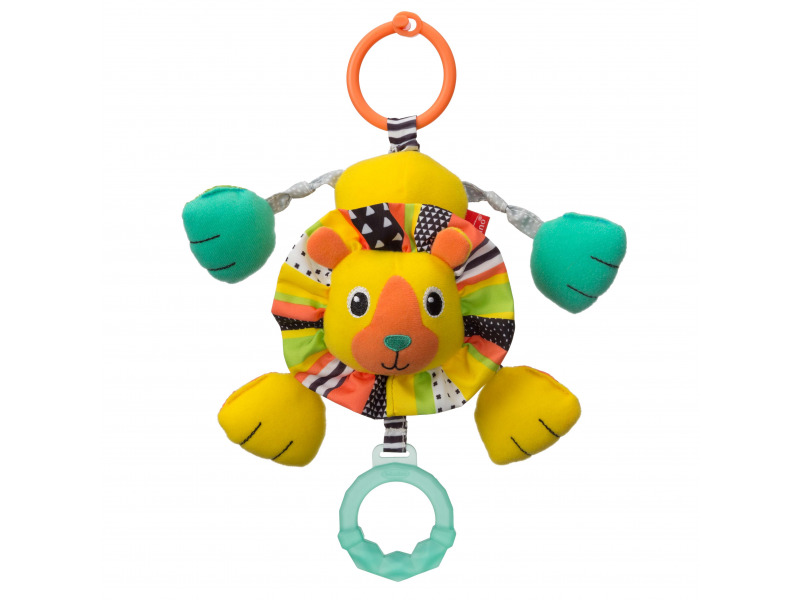 Lvíček upoutá pozornost dítěte svými výraznými barvami i chrastěním při pohybu. Po zatažení za šňůrku vibruje. Různorodé textury lákají dítě ke zkoumání. Kousátko pomáhá dítěti při prořezávání prvních zoubků.