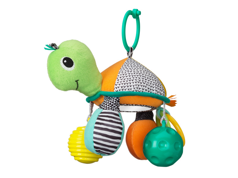 Usměvavá želva upoutá pozornost dítěte svými výraznými barvami, chrastěním při pohybu i bezpečným zrcátkem na bříšku. Různorodé textury lákají dítě ke zkoumání. Dvě nohy želvičky jsou tvořeny míčky s výraznou strukturou pro zkoumání rukama i ústy.