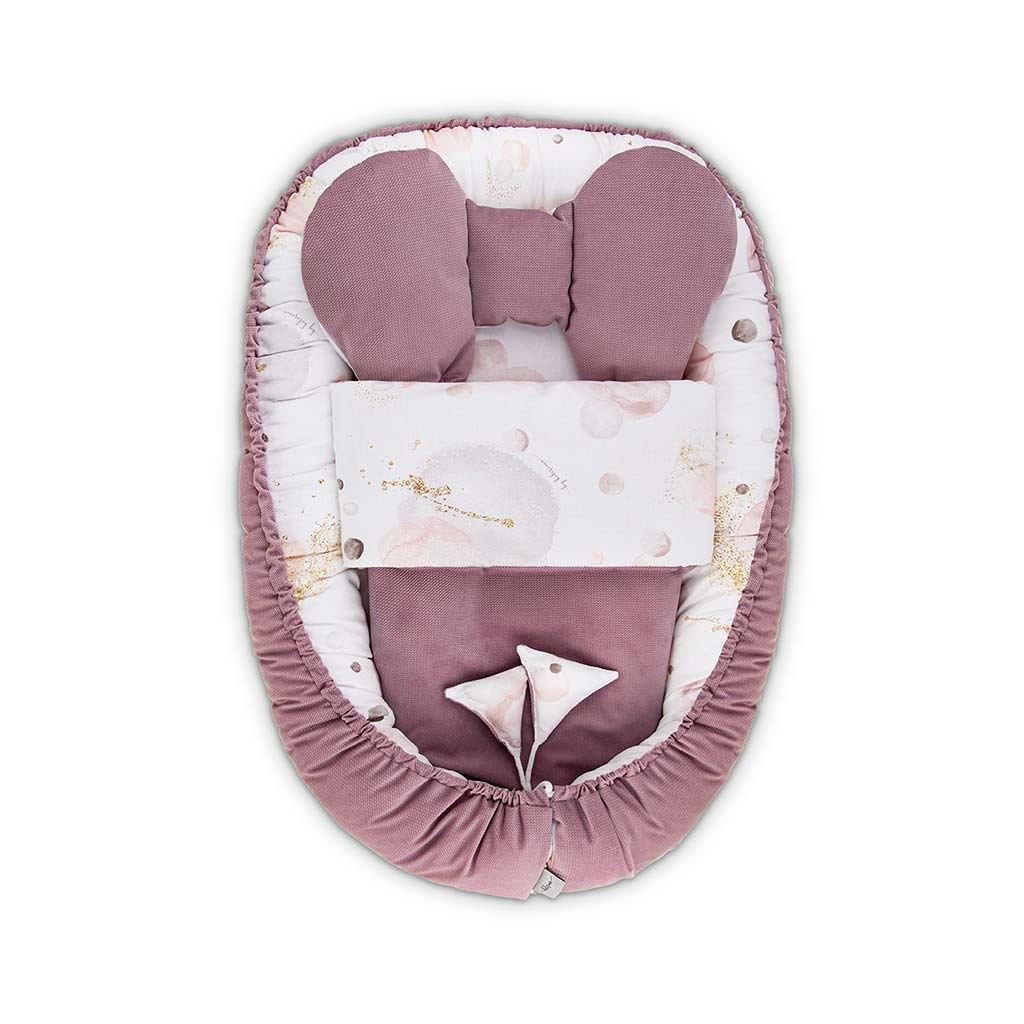 Hnízdo s peřinkou pro miminka Velvet Belisima Bubbles. Navozuje miminkům pocit bezpečí, kopíruje tvar mámina těla a děťátko se tak cítí spokojeně jako u maminky v bříšku. Součástí hnízda je i stabilizační polštářek a peřinka. Miminku se daleko lépe usíná a je klidnější. Složení: 100% bavlna, spodní část minky 100% polyester, výplň: 100% polyester. Rozměry: cca 55x75 cm, vnitřní rozměry: cca 35x59 cm. Peřinka: Rozměry: 70x50 cm. Složení: 100% bavlna, spodní část velvet 100% polyester, výplň: 100% polyester.