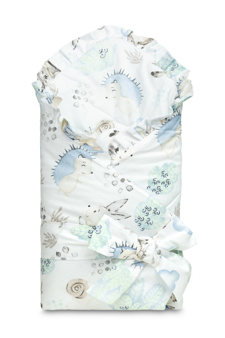 Dwustronny rożek niemowlęcy z falbanką został stworzony z myślą o noworodkach i niemowlętach. Wiązane zapięcie z szeroką bawełnianą tasiemką umożliwia wygodne trzymanie dziecka podczas karmienia i usypiania. Po rozłożeniu, rożek może być z powodzeniem stosowany jako kołderka do łóżeczka czy wózka dziecięcego. Może także służyć jako mata do zabawy. Wykonany został z bawełny 100%. Wypełnienie rożka to włóknina puszysta silikonowa. Wykończenie stanowi gustowna falbanka.