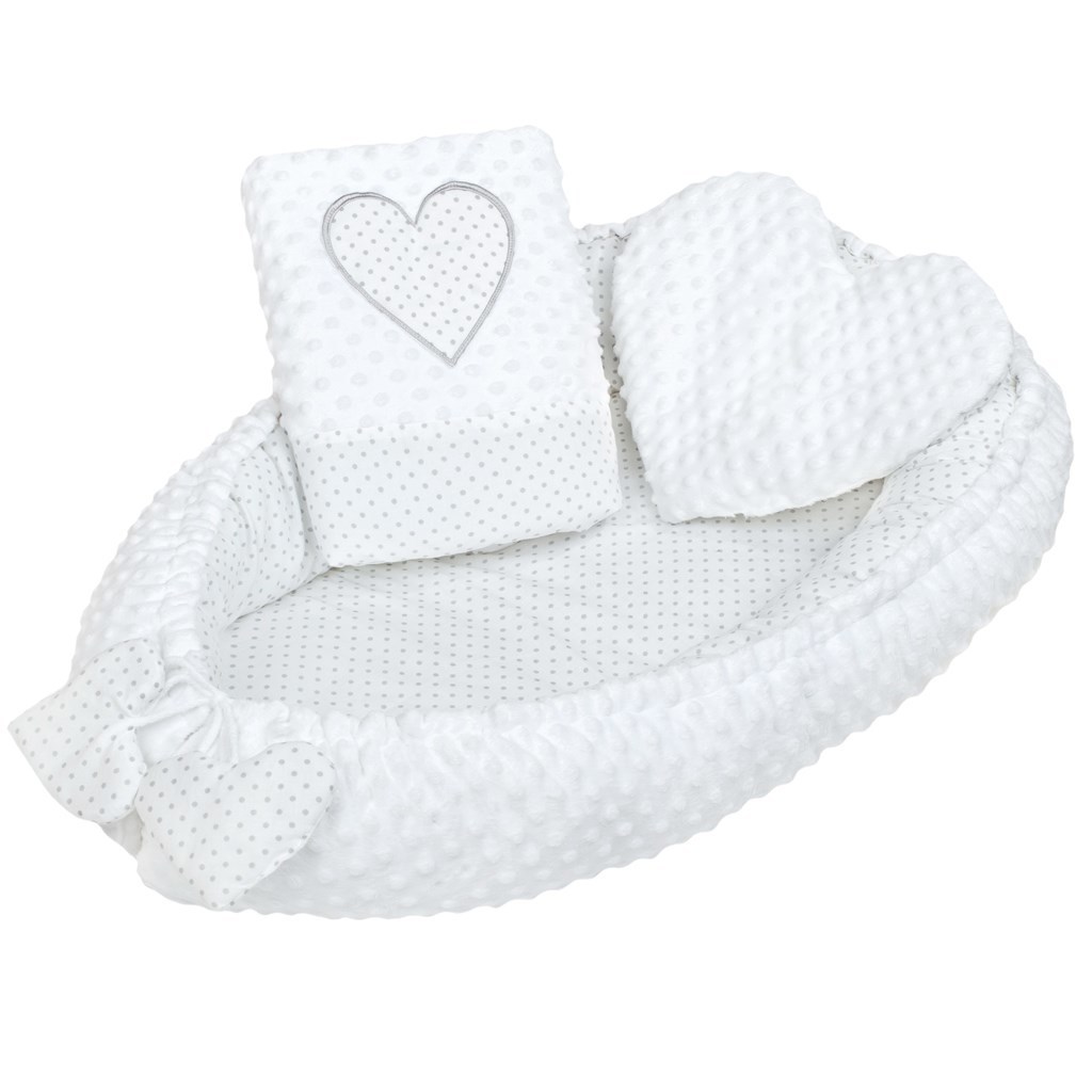Luxusní hnízdečko s peřinkou pro miminka New Baby Srdíčko. Hnízdečko je praktický vynikající pomocník v prvních měsících života dítěte. Hnízdečko je oboustranné, může se používat z vnější i vnitřní strany. Hnízdečko má praktickou šňůrku, kterou lze upravovat velikost, může se více stáhnout anebo úplně uvolnit. Hnízdečko je vyrobené ze dvou typů tkanin, první je velmi měkká a na dotek příjemná, hebká Minky látka s výstupky pro stimulaci senzomotoriky a druhá je 100% bavlna. Součástí hnízdečka je polštářek ve tvaru srdce a peřinka zdobená srdíčkem. Hnízdečko má mnoho využití, lze používat v postýlce, v kočárku, na pohovce i na zemi. Rozměry: cca 55x75 cm, vnitřní rozměry: cca 35x59 cm. Peřinka: Rozměry: 65x47 cm. Složení: jedna strana 100% bavlna, druhá strana minky 100% polyester, výplň: antialergické vlákno. Produkt české značky.