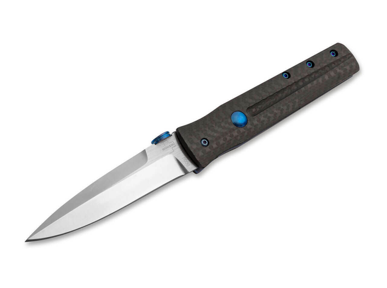 Rukojeť z uhlíkových vláken je lehká, pevná a zároveň příjemná na dotek. Jednoduchá nerezová vložka společně s odnímatelnou titanovou sponou na opasek, eloxovanou v atraktivní ledově modré barvě, umocňují prémiový dojem z nože. Součástí balení je praktické nylonové pouzdro pro bezpečné a pohodlné přenášení.