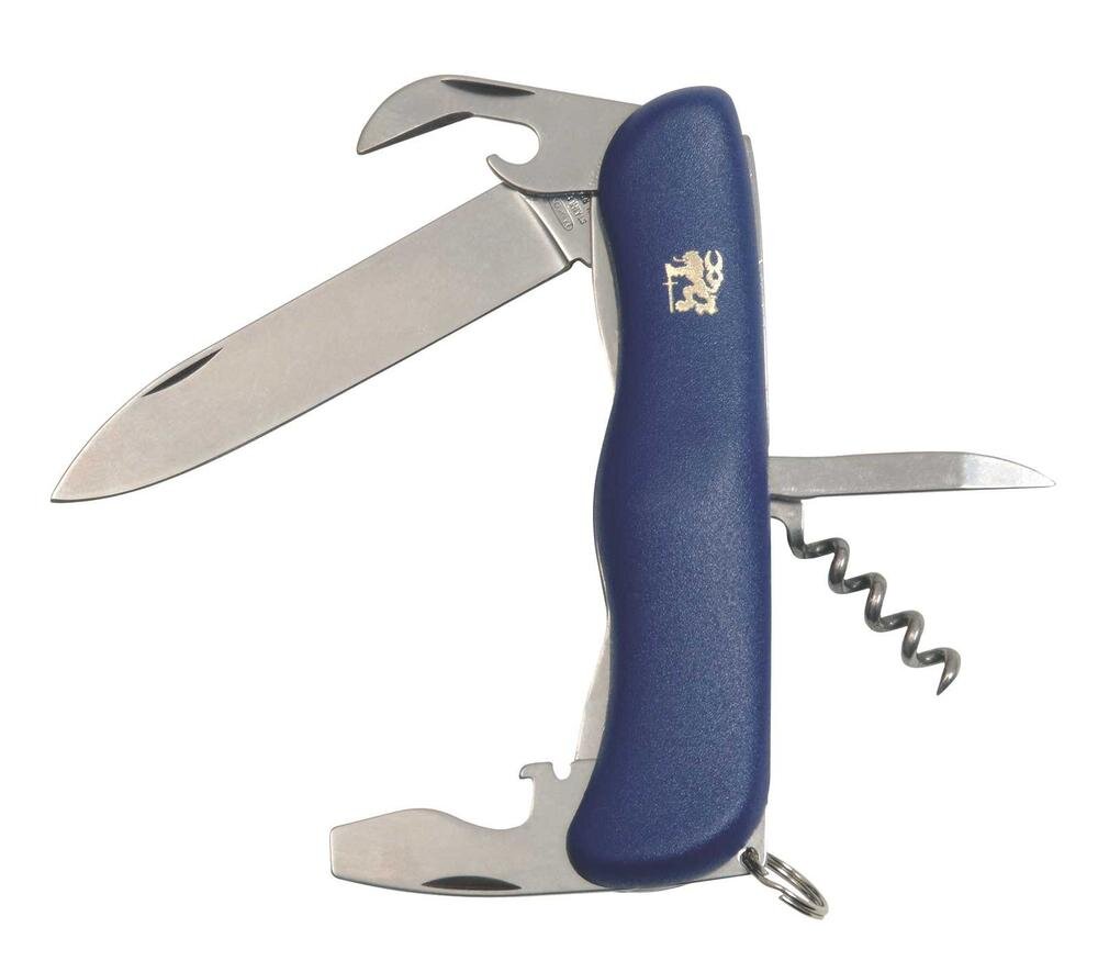 Má čepeľ s hladkou hranou z nehrdzavejúcej ocele 420, otvára sa manuálne a zaisťuje ju Linerlock. Rukoväť je z modrého odolného plastu s motívom leva, v spodnej časti má krúžok na zavesenie.