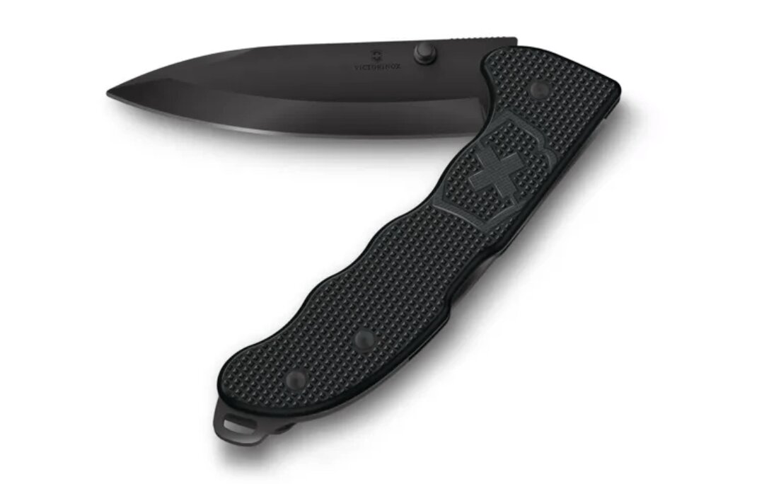 Štýlový outdoorový zatvárací nôž Victorinox Evoke BS Alox Black s čiernou čepeľou a rukoväťou Alox v čiernej farbe.