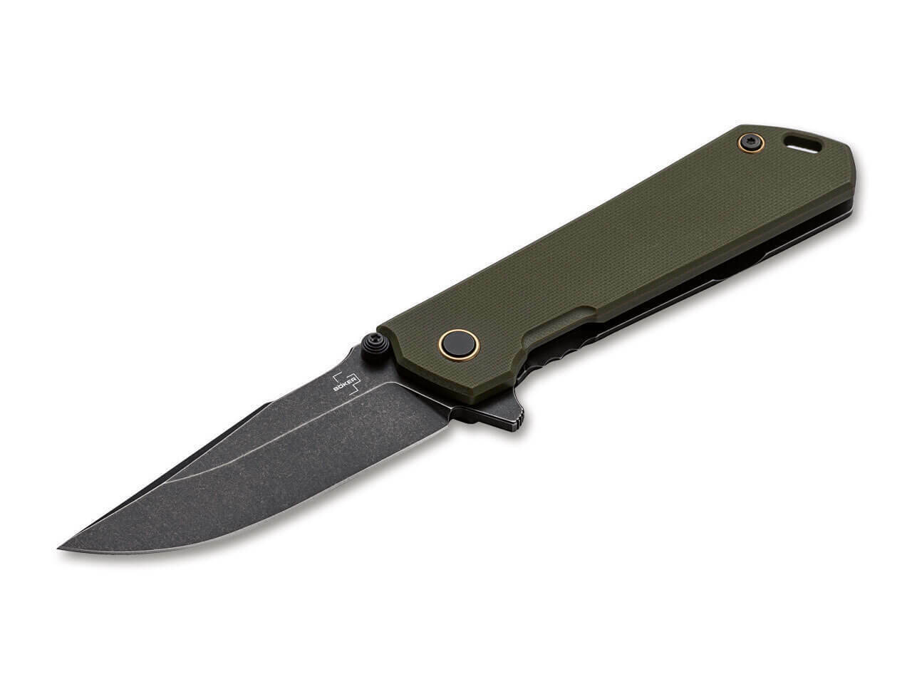 Böker Plus 01BO164 Kihon vreckový nôž s asistenciou 8,5 cm, Stonewash, zelená, G10, nylonové puzdro