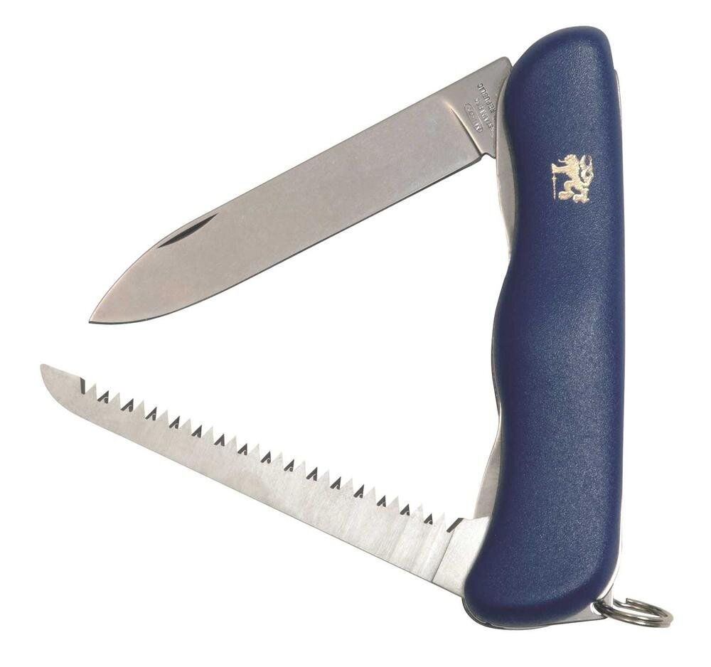 Má čepeľ s hladkou hranou z nehrdzavejúcej ocele 420, otvára sa manuálne a zaisťuje ju Linerlock. Rukoväť je z modrého odolného plastu s motívom leva, v spodnej časti má krúžok na zavesenie.