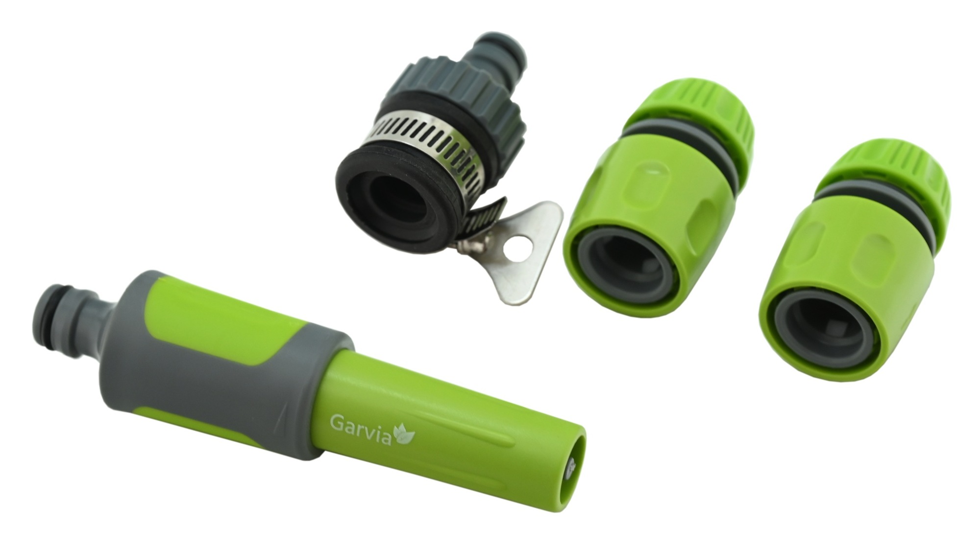 Praktická sada zavlažovací pistole s příslušenstvím pro připojení k zahradní hadici.