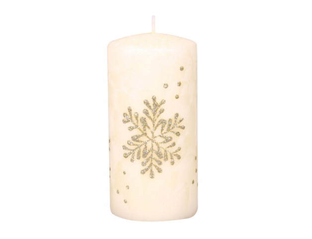 Vánoční svíčka ve tvaru válce je ozdobena glitrovanou vločkou. Barva: bílá. Průměr: 7 cm, výška: 14 cm.