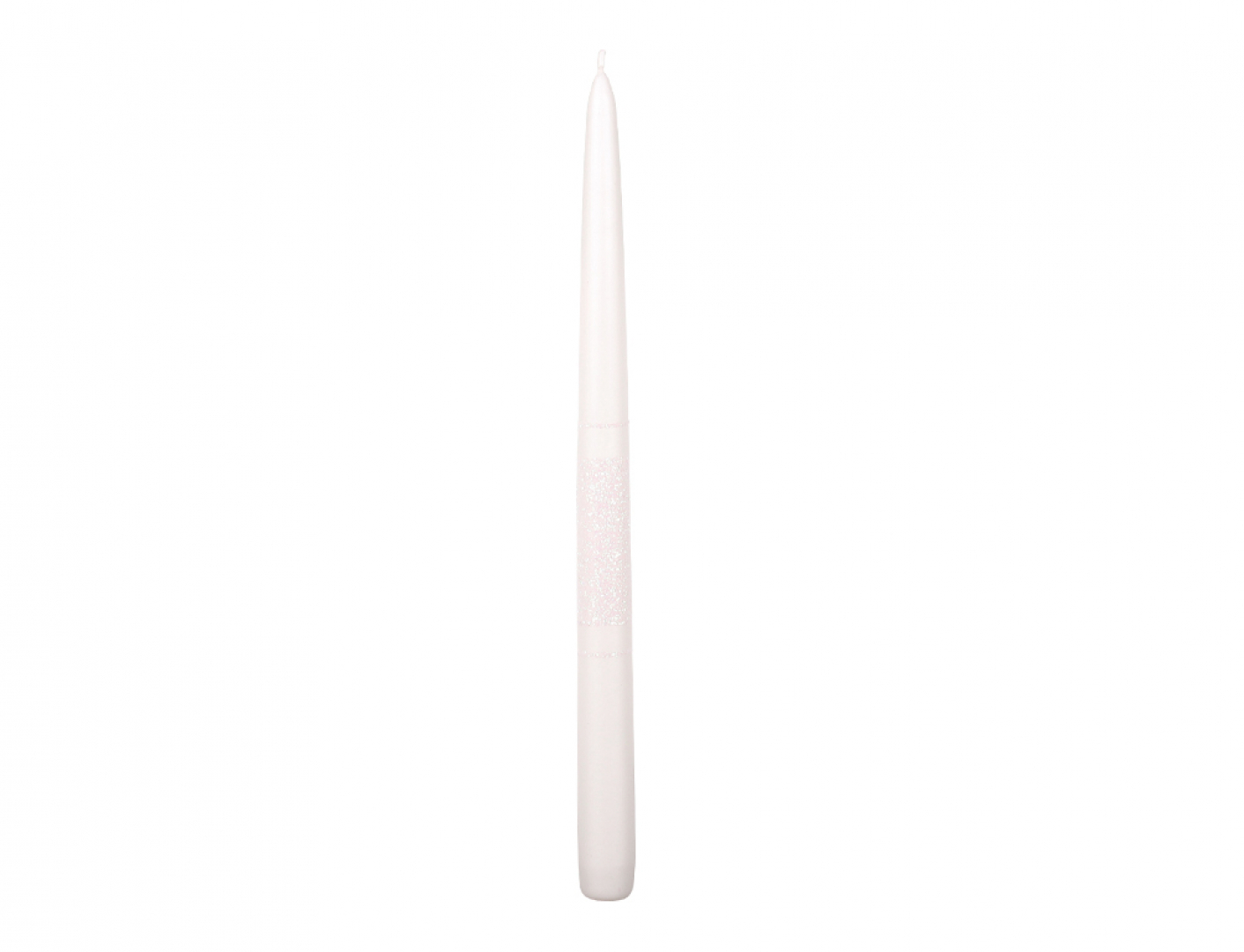 Stolní svíčka kónická. Její povrch je hladký v úpravě metalický mat. Navíc je zdobena různě širokými třpytivými proužky. Díky tomu je velmi zdobná a vyjímá se ve vánočních dekoracích. Doba hoření: 6 hodin. Rozměry: spodní průměr 2cm, výška 24 cm. Barva: bílá. číst celé