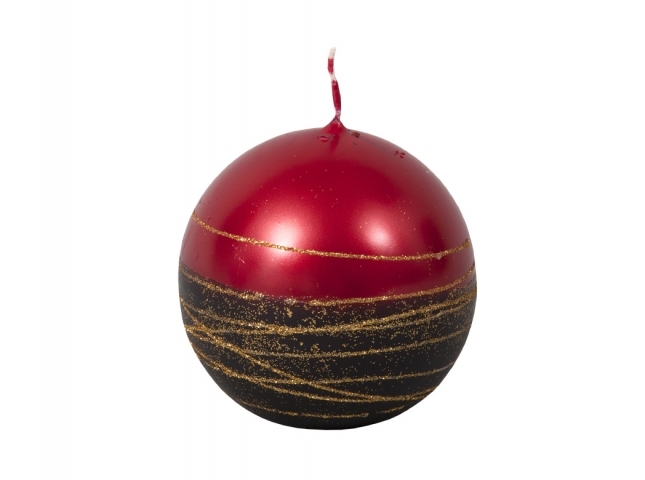 Vánoční svíčka ve tvaru koule napůl černá a napůl červená zdobená ve středu zlatými glitrovými proužky. Velikost: d8 cm. číst celé