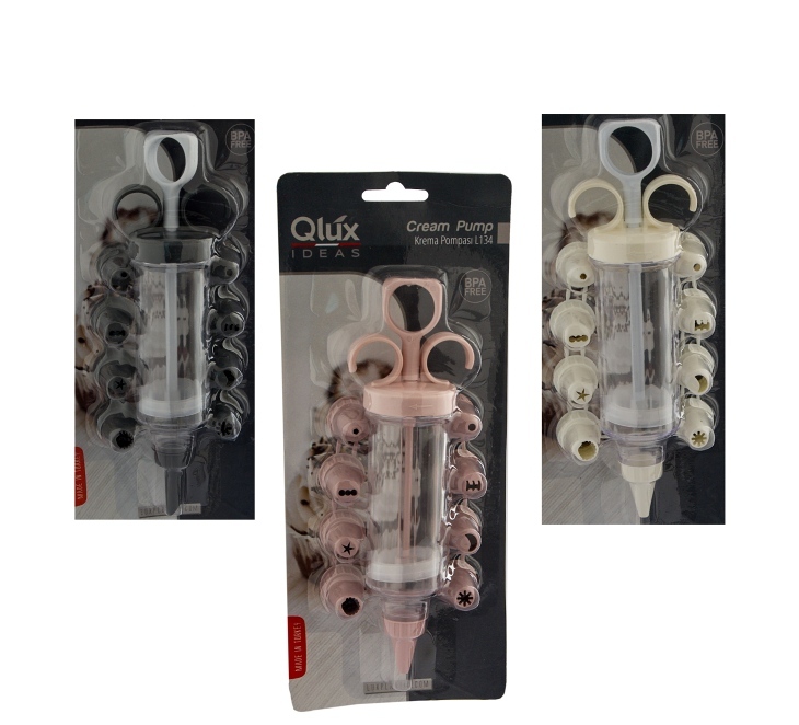 Sada na zdobení dortů a zákusků obsahuje zdobičku a 9 různých zdobicích špiček. Na zdobičku upevníte pomocí závitu zdobicí špičku. Využijete pro zdobení dortů, zákusků, cukroví, jednohubek... Vhodná na šlehačku, krémy, pomazánky (není vhodná na tuhá těsta). Materiál: plast PP + PE (stlačovadlo pístnice) + PS (pístnice + tělo). Rozměry: d. 21 cm, pr. 4,5 cm. Není vhodné do myčky.
