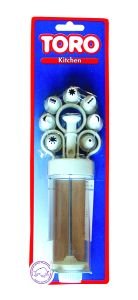 Tato zdobička ve tvaru injekce vám umožní snadno a přesně dávkovat krém, polevu nebo těsto. Součástí balení je 8 různých nástavců, které umožňují vytvářet rozmanité tvary a vzory, čímž ozvláštníte vaše dezerty a dáváte jim profesionální vzhled. Objem zdobičky je 150 ml, což je dostatek kapacity na zdobení i větších zákusků. Výrobek je vyroben z lehkého a snadno udržovatelného plastu. Nástavce o velikosti 2,2 cm jsou dostatečně univerzální pro různé dekorace a pečivo.