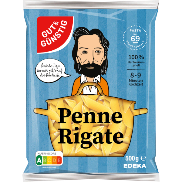 GG Penne Rigate těstoviny 500gKvalitní německé těstoviny z prvotřídních surovin - vyrobené ze 100% tvrdé pšenice.Návod k použití: Těstoviny vložte do vroucí lehce osolené vody (cca 1 L na 100g těstovin) a za občasného míchání vařte po dobu 10 minut. Poté těstoviny vyjměte, přeceďte z vody a můžete podávat.
