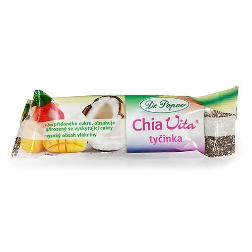 Chia Vita tyčinka Dr. Popova, 36 g, obsahuje chia semínka, mango, kokos. Bez přidaného cukru. Obsahuje přirozeně se vyskytující cukry. Má vysoký obsah vlákniny. číst celé