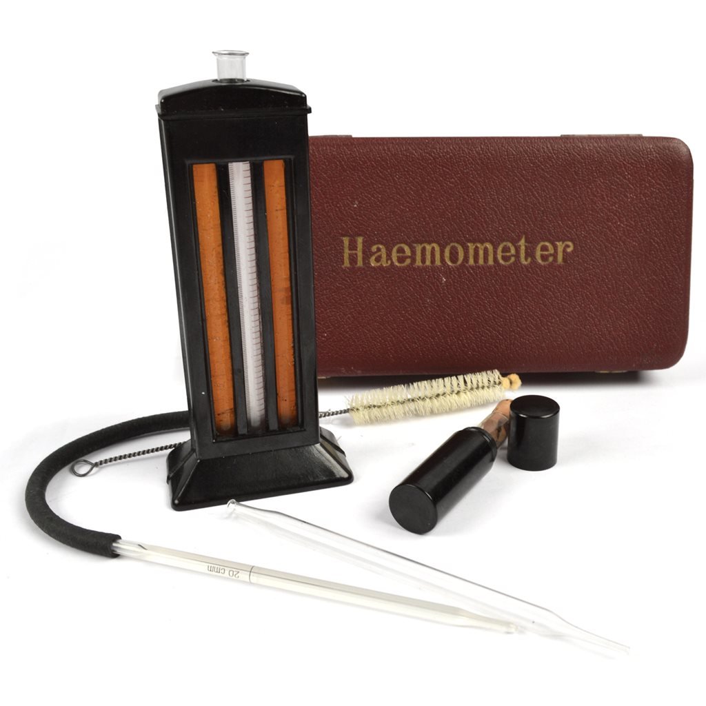 Souprava pro zjištění hemoglobinu v krvi. Provedení a krabička se může mírně lišit od vyobrazení. Dlouhobě uložený skladový materiál bez záruky funkčnosti, určeno k dekorativním účelům.