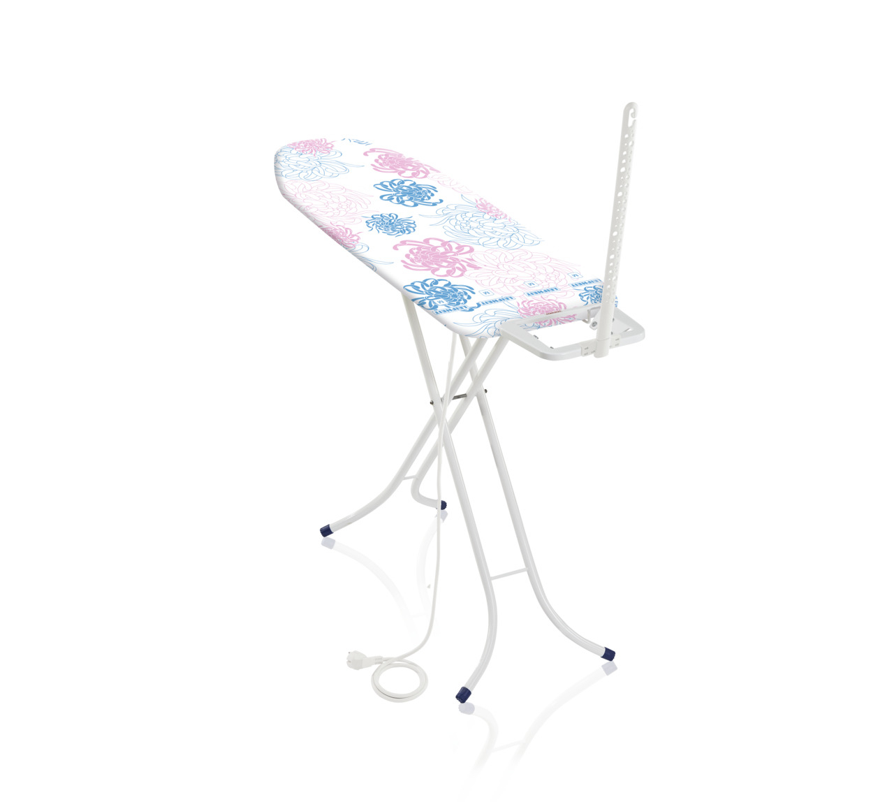 žehlicí plocha M : 120 x 38 cm, plynule nastavitelná výška od 76cm až do 87 cm, pevná odkládací plocha pro žehličku s vodící anténou na kabel a německou elektrickou zásuvkou s prodlužovačkou, ideální pro začátečníky nebo malé až střední domácnosti, záruka 3 roky