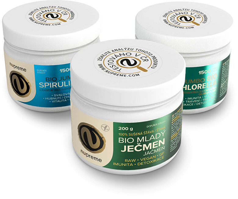 Balíček obsahuje Spirulinu Jumbo BIO 1500 tablet, Mladý Ječmen BIO 200 g a Chlorellu Jumbo BIO 1500 tablet.
