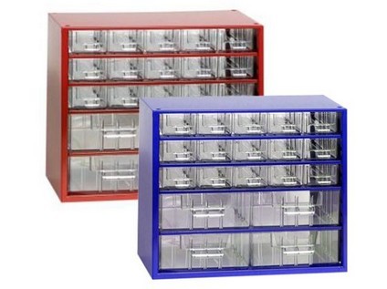 Kovová ukládací skříňka s plastovými zásuvkami 2 velikostí je vhodná pro přehledné skladování drobných předmětů a součástek.