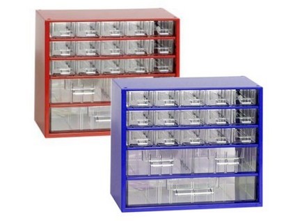 Kovová ukládací skříňka s plastovými zásuvkami 3 velikostí je vhodná pro přehledné skladování drobných předmětů a součástek.