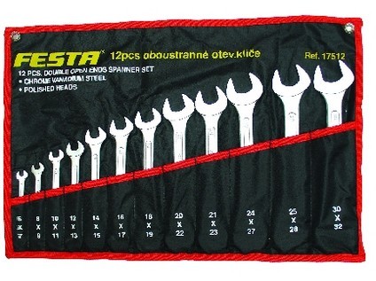 Sada oboustranných otevřených plochých klíčů FESTA, které jsou vhodné pro povolování a utahování šroubů, matic a vrutů se šestihrannou hlavou příslušného rozměru.