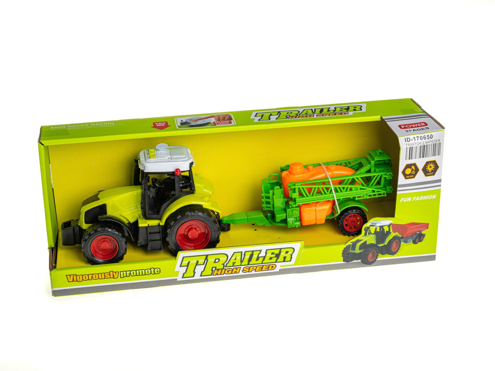 Traktor se zemědělským strojem, na setrvačník, světlo, zvuk; 42x16x11cm, 3xAG13 jsou součástí číst celé