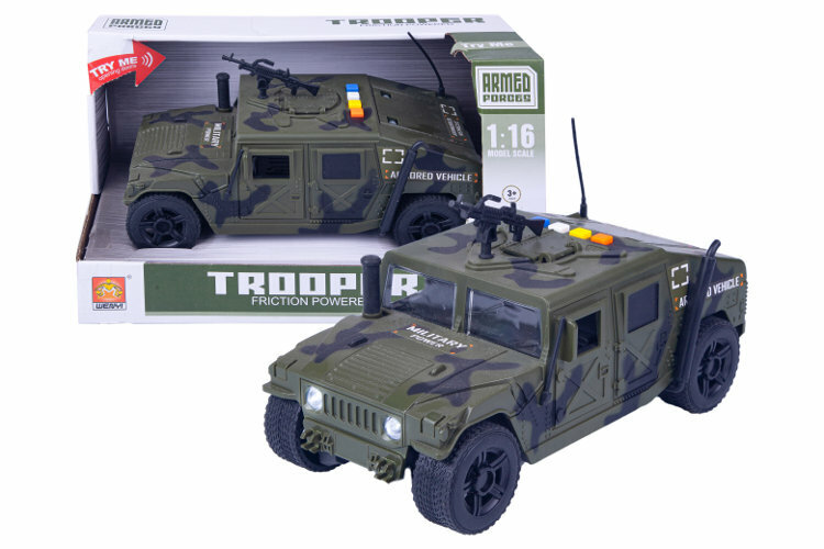 Auto wojskowe z karabinem na dachu i napęd - auto pchnięte do przodu kontynuuje jazdę samodzielnie.Zabawka posiada efekty świetlne i dźwiękowe.- zabawka ze światłem i dźwiękiem,- zasilane na baterie (w zestawie),- obrotowy karabin (360°),- rodzaj napędu: friction (koło zamachowe).Rozmiar auta: 24.0 x 12.0 x 11.0 cm (bez karabinu)Rozmiar opakowania: 29.0 x 13.0 x 18.0 cmZasilanie: 3 x baterie AG13/LR44 (baterie testowe w zestawie)
