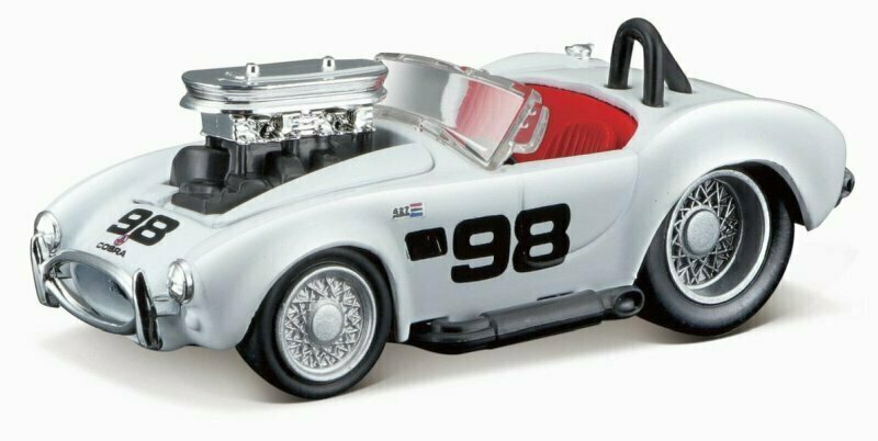 Mały model samochodu (biały) Mustang Shelby Cobra 1964. Posiada oryginalną licencję. Został wykonany z dbałością o detale. Sylwetka auta jest odwzorowana bardzo realistycznie, dlatego pojazd przypomina swój pierwowzór z rzeczywistości. Na masce zobaczymy dużą turbinę (turbo). Natomiast w środku umieszczono kierownicę, kokpit oraz siedzenia. W projekcie nie pominięto również logo. Zabawka może pełnić funkcję kolekcjonerską. Dzięki temu, że posiada ruchome koła, dziecko może się nią bawić w klasyczny sposób.Wymiary opakowania: 13,5x5,5x16,5cmWiek: 8+