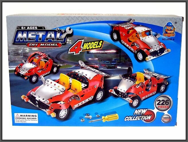 Zestaw klocków konstrukcyjnych składa się z 226 elementów, z których po samodzielnym zbudowaniu powstaną 4 pojazdy. Połączenie metalowych i plastikowych części sprawia, że zabawki są niezwykle trwałe. Dzieci mogą w nieskończoność demontować i składać auta na nowo. Liczne elementy umożliwiają maluchom stworzenie innych modeli według własnej fantazji. Zabawki do samodzielnego montażu doskonale rozwijają umiejętności techniczne, trenują cierpliwość i uczą samodzielności. W zestawie znajdują się niezbędne narzędzia do zabawy. Wymiary modeli: -22,5x11,5x10,2cm,-22,2x13,5x8cm,-22,5x13,6x7,5cm-21,5x13,x10,5cm,Wymiary opakowania: 39x26x7cm.Wiek: 6+.