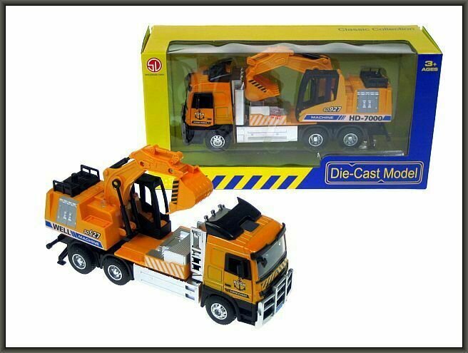 Auto budowlane opracowane zostało z myślą o małych fanach maszyn budowlanych. Zabawkowa koparka wykonana została z plastiku z metalowymi elementami. Zabawka składa się z ciężarówki z naczepą, na której znajduje się koparka z obrotową kabiną i ruchomym ramieniem. Dodatkowo auto posiada efekty świetlno-dźwiękowe. Po otwarciu drzwi w kabinie ciężarówki przednie oświetlenie zacznie migać i pojawią się charakterystyczne dźwięki alarmu, odpalania i pracy silnika. Pojazd wykonany jest w skali 1:32 i doskonale odzwierciedla prawdziwy model koparki.Cechy:zabawka w kolorze pomarańczowym z czarnymi elementami,koła są gumowe i posiadają imitację bieżnika,maszyna na naczepie obraca się o 360 stopni,ramię koparki i łyżka jest ruchome, podnosi się lekko do góry,koparaka wyposażona jest w napęd frykcyjny(pojazd rozpędzany jest poprzez poruszenie go na gładkiej powierzchni),wymagane baterie: 3xAG13(1,5V, w zestawie),wymiary zabawki : 22x6x11cm,wymiary opakowania: 30x15x10,7cm,wiek: 3+.