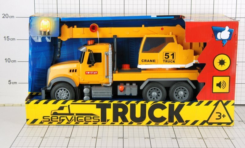 Samochód ciężarowy z ruchomym hakiem na sznurku. Generuje efekty dźwiękowe i świetlne. Posiada napęd frykcyjny. Auto zostało wyposażone w ruchomy wysięgnik, który obraca się nie tylko na boki, ale również rozkłada się w górę. Możemy zmieniać wysokość haku zawieszonego na sznurku przy pomocy specjalnej korbki. Kabina posiada czarne szybki. Zabawka odznacza się kolorami, które są charakterystyczne dla aut drogowych. Obrotowe opony z gumy mają wyraźnie oznaczony bieżnik. Po naciśnięciu na przyciski znajdujące się na dachu włączamy sygnał świetlny i dźwięki.Baterie: 3xAG13 (dołączono)Wymiary opakowania: 42x14x21cmWiek: 3+