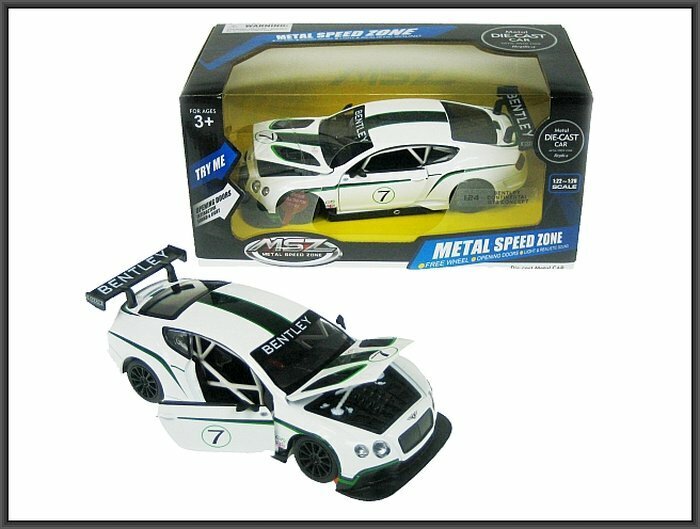 Bentley Continental GT3 20cm Modele charakteryzują się znakomitą jakością i wiernością wykonania.Model wykonany jest z metalu i plastiku i gumowych opon.Posiada otwierane drzwi oraz skrętne koła.Gdy przyciśniesz lekko autko do dołu zaświecą się przednie światła oraz usłyszysz dźwięki : pracy silnika i jazdy.Za każdym razem, gdy otworzysz drzwi autka usłyszysz dźwięki alarmu i klaksonuZabawka jest przeznaczona dla dzieci powyżej 3 + roku życiaZabawka zasilana 3 bateriami AG13 (baterie dołączone są do autka)Wymiary opakowania : 24,5 cm x 13,5 cm x 12 cmWymiary modelu : 18,5 cm x 8,5 cm x 5 cm