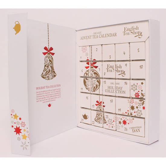 Adventní kalendář bílý, ve stylu knihy, 24 pyramidek, 12 příchutí Příchutě / Složení: BÍLÝ ČAJ, LYCHEE, KAKAO - Bio bílý čaj se skořicí, kakaem, kokosem a lychee Složení: bio bílý čaj(77%), bio kousky skořice(8%), bio kousky kakaa(6%), přícrodní příchuť a aroma(5%), bio kousky kokosu(3%), bio lychee (1%). VANILKA MÁTA & MANGO - Bio zelený čaj s citronovou trávou, mátou, skořicí, vanilkou a mangem Ingredients: bio zelený čaj(66%), bio citronová tráva(8%), bio listy máty(8%), bio kousky skořice(5%), přírodní příchutě a aroma(5%), bio vanilkové lusky(4%), bio kousky manga(4%). ZÁZVOR BRUSINKA - Bio černý čaj se zázvorem, skořicí, hřebíčkem a brusinkami - Složení: Bio černý čaj(65.5%), bio kousky zázvoru(8%), bio kousky skořice(8%), přírodní příchuť a aroma(5%), bio hřebíček(4.5%), bio ženšen(4.5%), bio brusinky(4.5%). ZELENÝ ČAJ, MED, MÁTA - Bio zelený čaj a máta, skořice a lékořice Složení: Bio zelený čaj(68%), bio máta(13%), bio skořice(8%), bio lékořice(6%), přírodní příchuť a aroma(5%). Obsahuje lékořici - osoby trpící hypertenzí by se měly vyvarovat nadměrné konzumace. SLADKÝ VANILKOVÝ CHLEBÍČEK - Bio černý čaj se skořicí, zázvorem, kardamonem, jablkem a vanilkou Složení: Bio černý čaj(62%), bio kousky skořice(12%), bio kousky zázvoru(12%), přírodní příchuť a aroma(5%), bio kardamon(3%), bio jablko(3%), bio vanilkové lusky(3%). BÍLÝ ČAJ, BORŮVKY & BEZINKA - Bio bílý čaj s bezinkou a borůvkami Složení: Bio bílý čaj(63%), bio citronová tráva(17%), bio bezinka(10%), bio kousky borůvek(5%), přírodní příchuť a aroma(5%). KOŘENĚNÉ ČERVENÉ OVOCE - Bio ibiškový bylinkový čaj, šípek, jablko, skořice a červené ovoce Složení: Bio ibišek(47%), bio šípek(36%), bio kousky jablek(5%), bio skořice(5%), přírodní příchuť a aroma(5%), bio máta peprná(2%). Pikantní Směs - Bio černý čaj se skořicí, jablkem, lékořicí, pomerančem, šípkem a vanilkou Složení: Bio černý čaj(50%), bio kousky skořice(26%), bio kousky jablek(5%), bio lékořice(5%), přírodní příchuť a aroma(5%), bio pomerančová kůra(3%), bio šípek(3%), lusky vanilky(3%). Obsahuje lékořici - osoby trpící hypertenzí by se měly vyvarovat nadměrné konzumace Ovocný pikantní koláč - Bio bylinkový čaj s rooibosem, jablkem, malinami, borůvkami, brusinkami a skořicí Složení: Bio rooibos(73%), bio kousky jablek(10%), přírodní příchuť a aroma(5%), bio maliny(3%), bio borůvky(3%), bio brusinky(3%), bio kousky skořice(3%). ČOKOLÁDA ROOIBOS & VANILKA - Bio bylinkový čaj s rooibosem, kousky kaka a vanilkový lusk Složení: Bio rooibos(89%), přírodní příchuť a aroma(5%), bio vanilkový lusk(3%), bio kousky kakaa(3%). ZELENÝ ČAJ A GRANÁT JABLKO - Bio zelený čaj s granát jablkem a okvět. listy růže Složení: Bio a fairtrade zelený čaj(85%), bio okvět listy růže(5%), kousky bio granát jablka(5%), přírodní příchuť a aroma(5%) Slavnostní den - Bio bylinkový čaj s heřmánekem, skořicí, jablkem, kakaem, šípkem a pomerančem Složení: Bio heřmánek(46%), bio kousky skořice(18%), bio kousky jablek(12%), bio kokos(11%), bio šípek(5%), přírodní příchuť a aroma(5%), bio pomerančová kůra(3%).