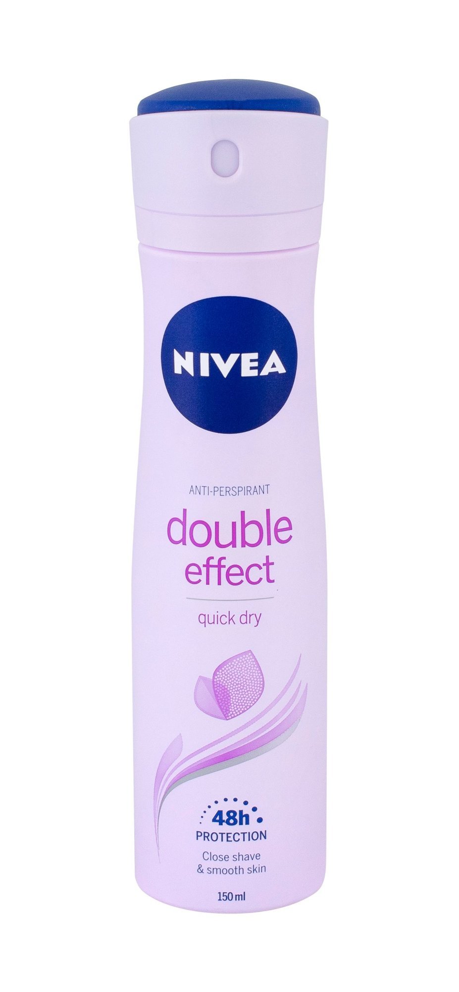 Sprej antiperspirant **Nivea Double Effect Anti-perspirant Spray**. Hladké podpaží déle než jste zvyklá. S přírodními výtažky z avokáda. 48h ochrana proti pocení. Bez alkoholu a barviv. Dermatologicky testováno a schváleno. **Použití:** Aplikujete ze vzdálenosti 15cm přímo na pokožku podpaží. Nechte zaschnout. Nepoužívejte na poraněnou či podrážděnou pokožku.