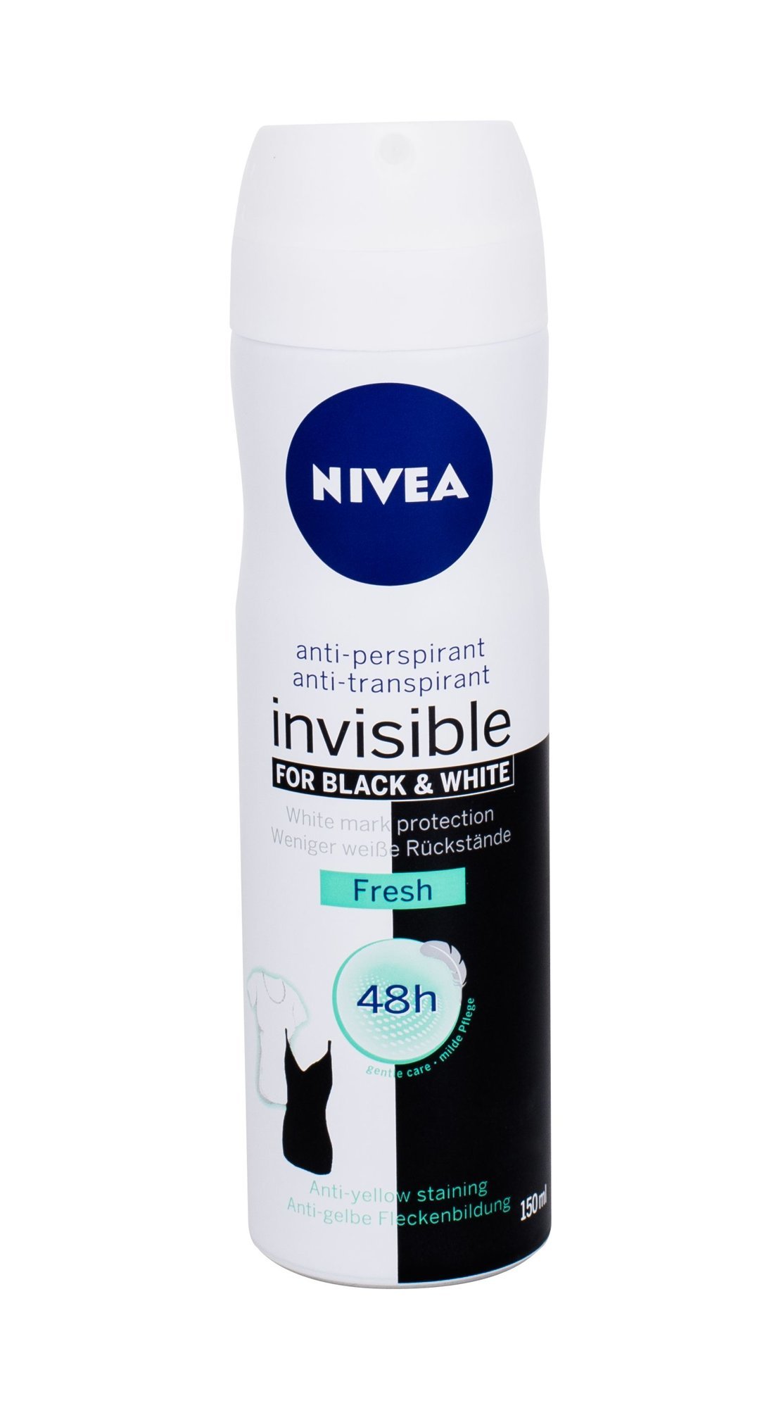 Sprej antiperspirant **Nivea Invisible Black & White Antiperspirant Spray Fresh**. Nezanechává bílé stopy na černém oblečení a předchází vzniku žlutých skvrn na bílém oblečení. 48h ochrana proti pocení. Bez alkoholu a barviv. Dermatologicky testováno a schváleno. Se svěží vůní pro pocit čistoty. **Použití**: Aplikujete ze vzdálenosti 15cm přímo na pokožku podpaží. Nechte zaschnout. Nepoužívejte na poraněnou či podrážděnou pokožku.