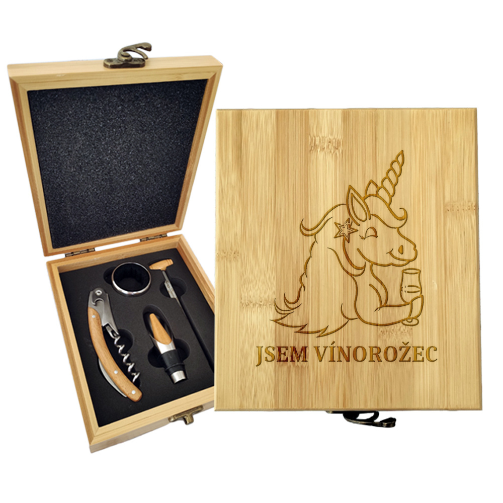 Dárková sada na víno v dřevěné krabičceIdeální dárek pro každého milovníka vína je dřevěná krabička se sadou na víno s originálním gravírovaným věnováním.Sada obsahuje 4 kusy a krabička je vyrobená z bambusu.Rozměry: 147×168×49 mm číst celé
