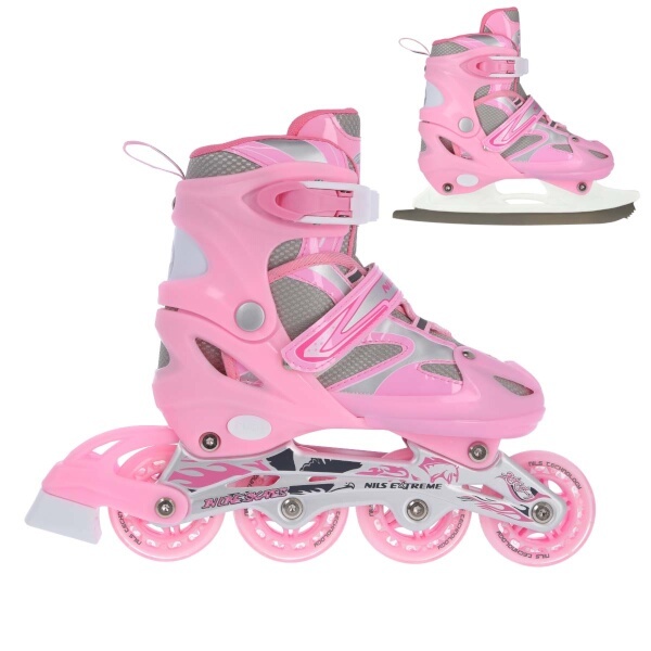 Zimní brusle NH 18366 A Nils Extreme 2v1 jsou navrženy pro začínající a pokročilé bruslaře. Jejich vysoká kvalita zaručuje dlouhou životnost a vysokou odolnost vůči poškození. Model NH 18366 A byl také vybaven čtyřstupňovým nastavením velikosti boty, kdy je možné ji nastavit dle potřeb uživatele. Je to způsob, jak ušetřit čas i peníze. Takové řešení prodlužuje jejich životnost a umožňuje, aby byly používány více než jednou osobou, nebo se dají použít jako brusle rostoucí s nohou dítěte. Samotná bota je vybavena membránou pro správnou cirkulaci vzduchu. Zapínání brusle je řešeno trojkombinací plastové přezky, suchého zipu a klasického šněrování. Nůž je vyroben z tvrdé, nerezové oceli. Konstrukce kolečkové lišty je z hliníku. Vložka je vyrobená z husté, 8 mm vysoké pěny.