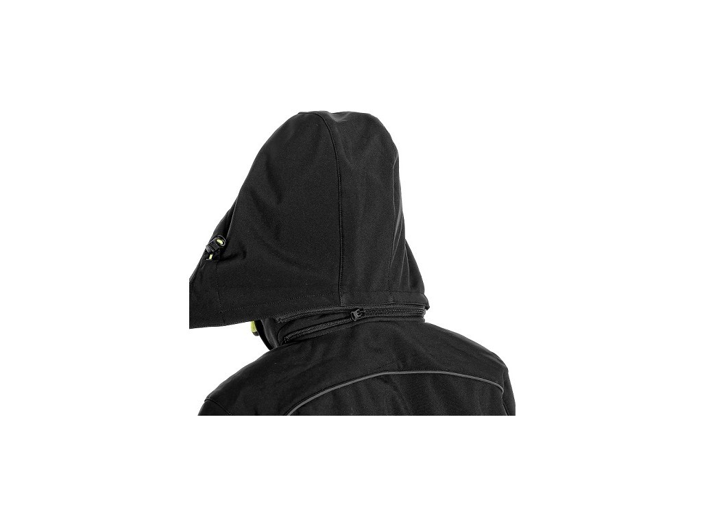 Dětská softshellová bunda, odolná proti vodě a větru, odepínací kapuce, stahování v dolním okraji, rukávy do gumičky, reflexní doplňky, TPU membrána, odolnost materiálu proti průniku vody (mimo oblast švů a mimo materiálu kolem kapes) 10 000 mm, paro