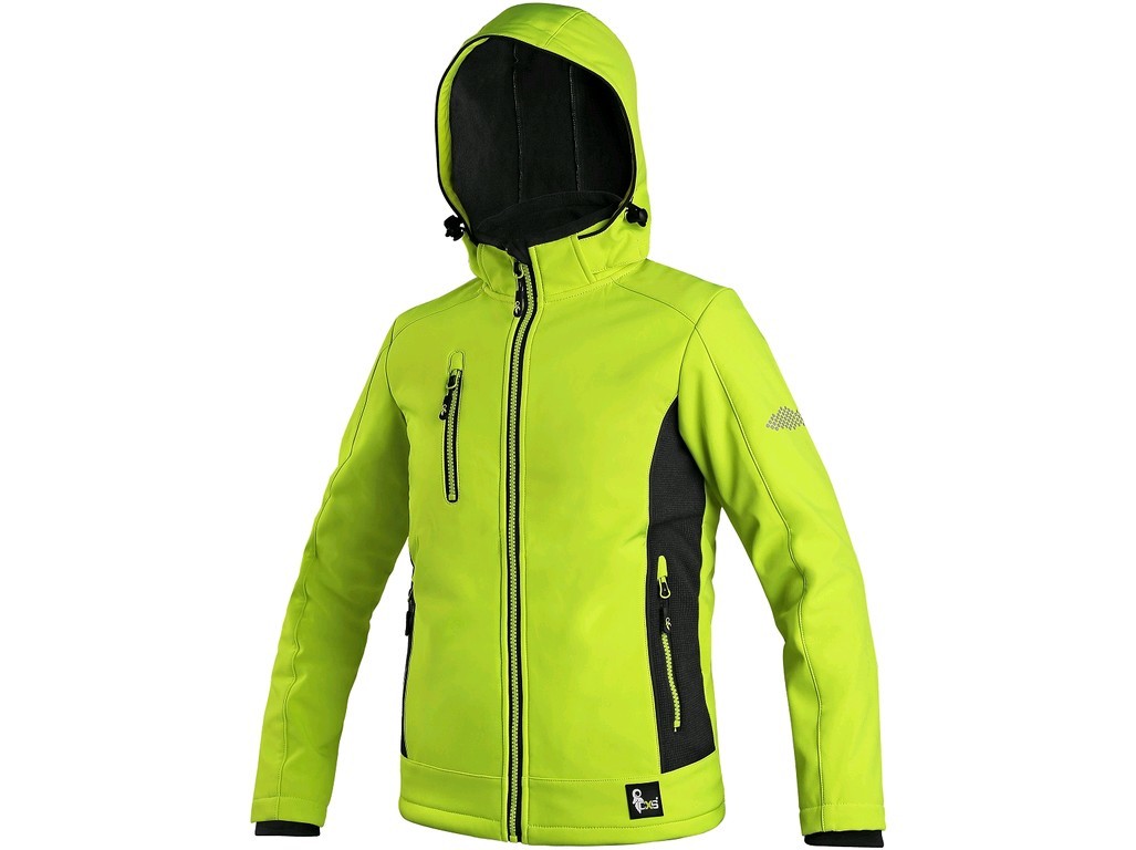 Dětská softshellová bunda, odolná proti vodě a větru, odepínací kapuce, stahování v dolním okraji, rukávy do gumičky, reflexní doplňky, TPU membrána, odolnost materiálu proti průniku vody (mimo oblast švů a mimo materiálu kolem kapes) 10 000 mm, paro