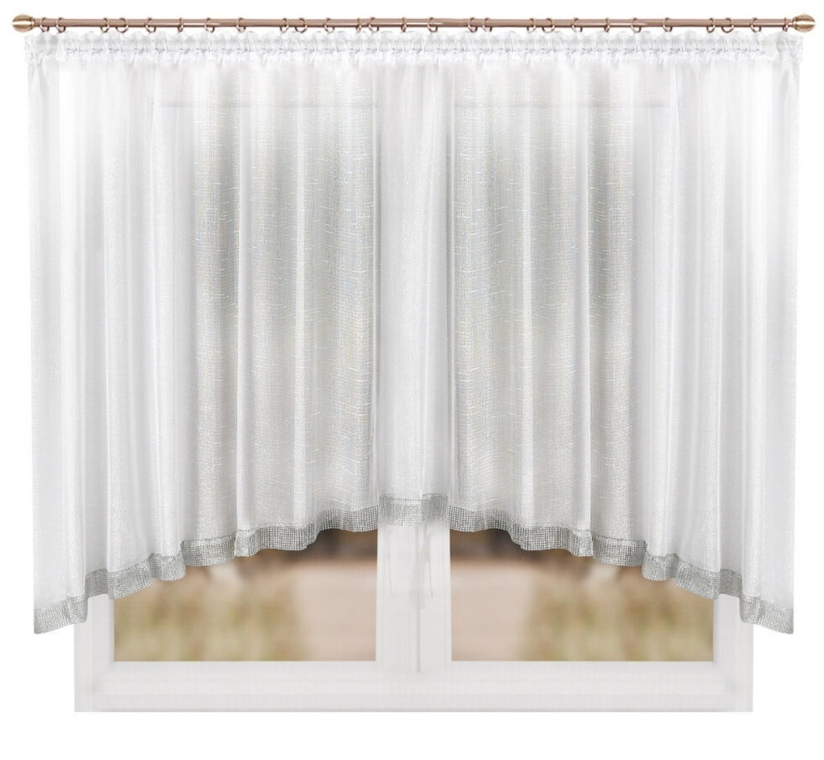 Kvalitní krátká hotová dekorační voálová záclona zdobená imitací zirkonů v rozměru 400x150 cm. Záclona má našitou řasící pásku s tunýlkem pro zavěšení na tenčí garnyž, žabky nebo háčky. Záclona je na spodní části zdobena ozdobným pásem z imitace zirkonů. 1 kus v balení. Záclona má lesklý luxusní efekt.