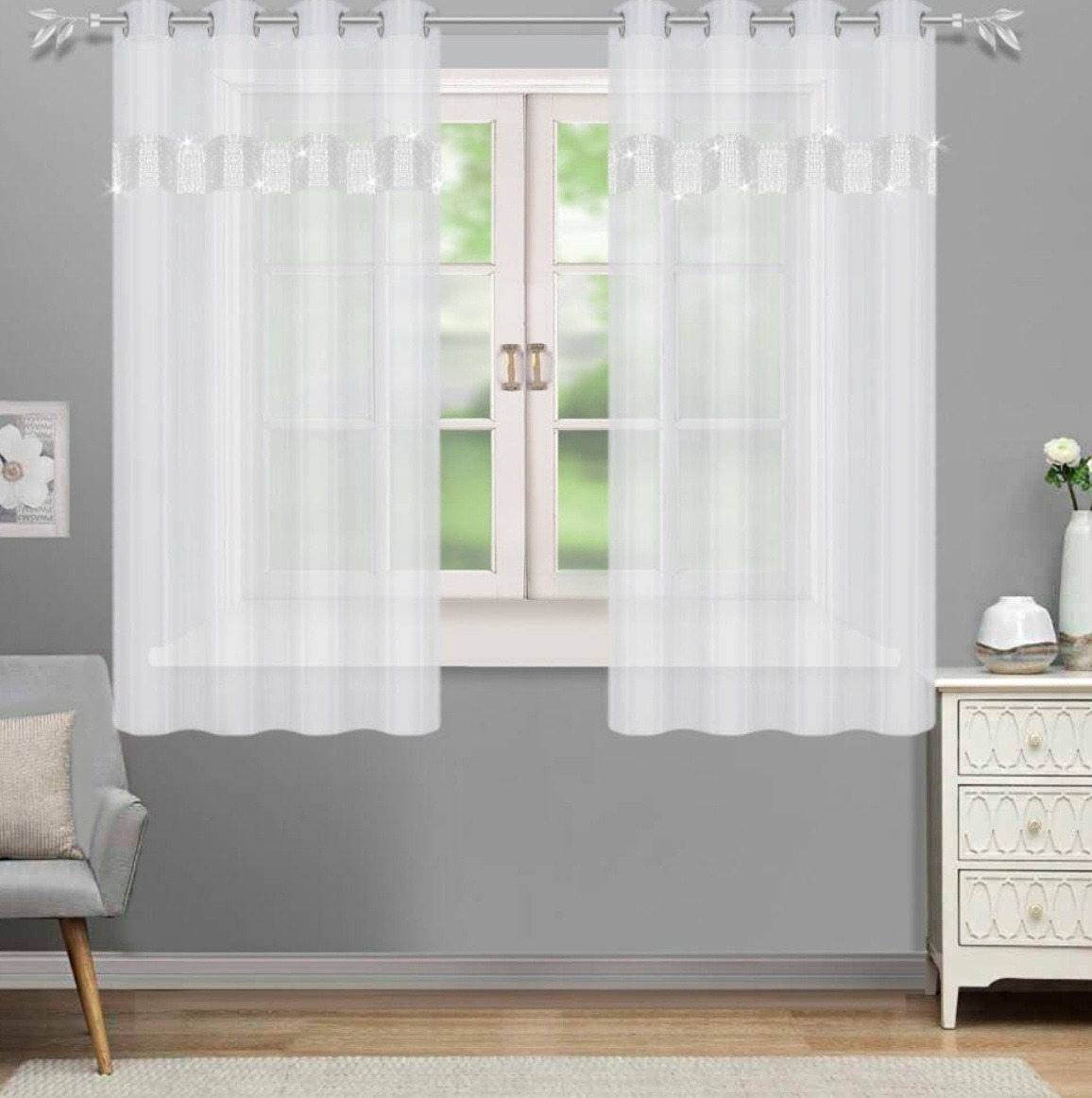 Kvalitní krátká hotová dekorační voálová záclona zdobená imitací zirkonů v rozměru 145x160 cm. Záclona s kroužky pro zavěšení na garnýž má jemné lemování. Záclona je zdobena 12 cm ozdobným pásem z imitace zirkonů. 1 kus v balení.