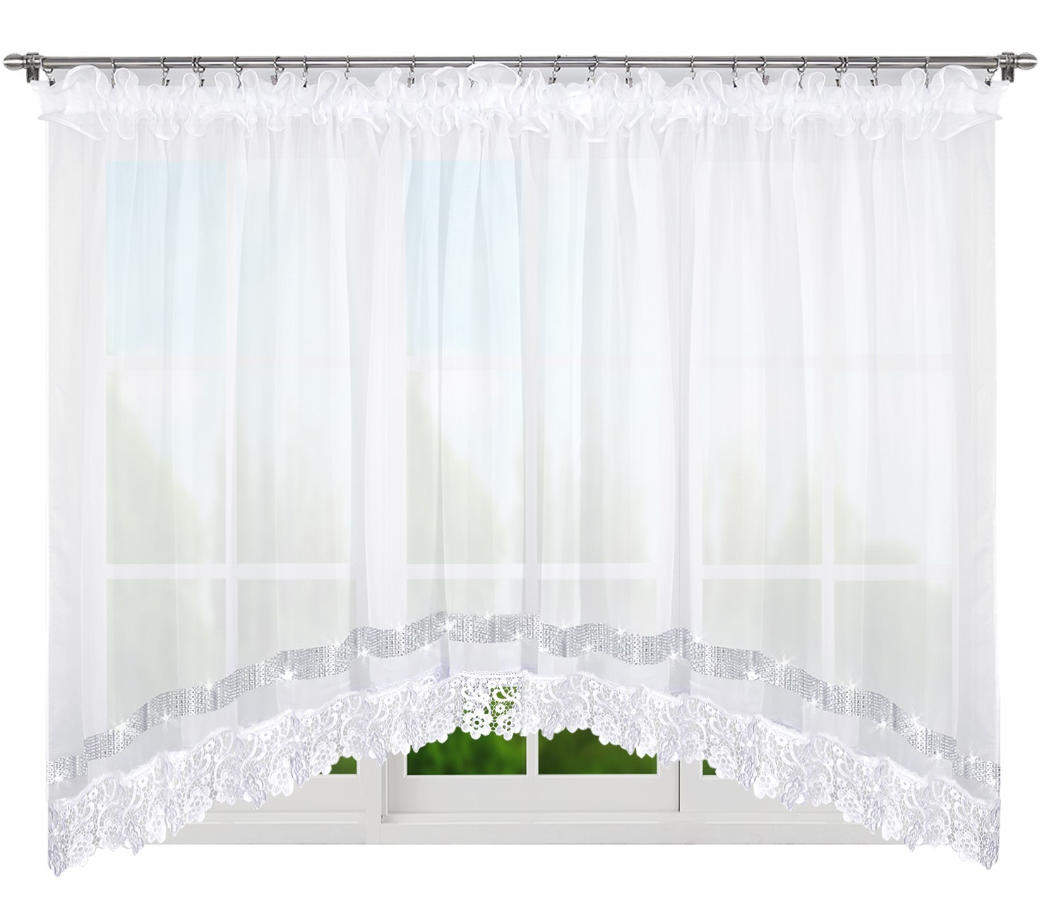Kvalitní vzorovaná krátká hotová dekorační voálová záclona zdobená imitací zirkonů v rozměru 400x165 cm. Záclona má našitou řasící pásku s tunýlkem pro zavěšení na tenčí garnyž, žabky nebo háčky, má jemné lemování. Záclona je na spodní části zdobena ozdobným 4 cm pásem z imitace zirkonůa luxusní krajkou širokou 15 cm. 1 kus v balení.