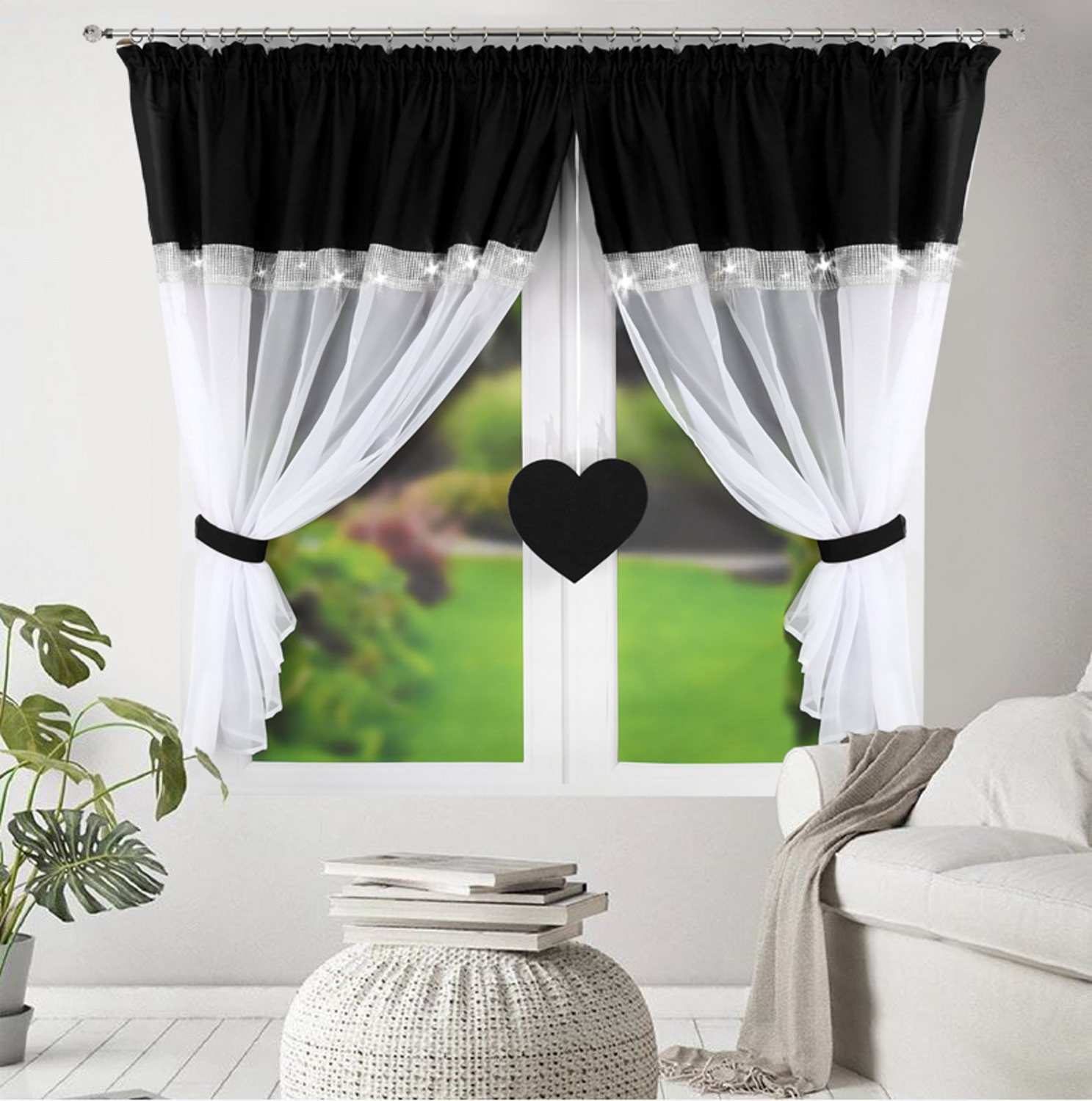 Tato kvalitní krátká dekorační záclona je vyrobena z lehkého voálového materiálu s jemným vzorem, který propouští světlo a zároveň poskytuje dostatek soukromí. Díky našívané řasící pásce a tunýlku ji jednoduše zavěsíte na garnyž, žabky nebo háčky. Záclona je doplněna 6 cm pruhem imitujícím zirkony, který dodává celému výrobku elegantní vzhled a působí velmi jemně a decentně. Součástí balení je také roztomilé srdíčko na zavěšení, které podtrhuje dekorativní charakter záclony.