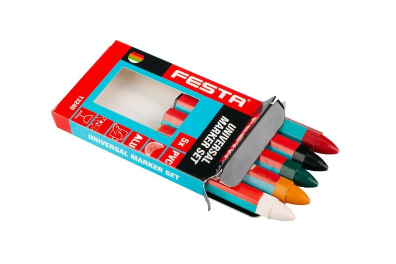 Sada pastelových popisovačů, délka 120 mm, v balení 5 barev (červená, černá, žlutá, zelená, bílá). Vhodné pro: zdivo, kovy, dřevo, sklo, plast, keramika.