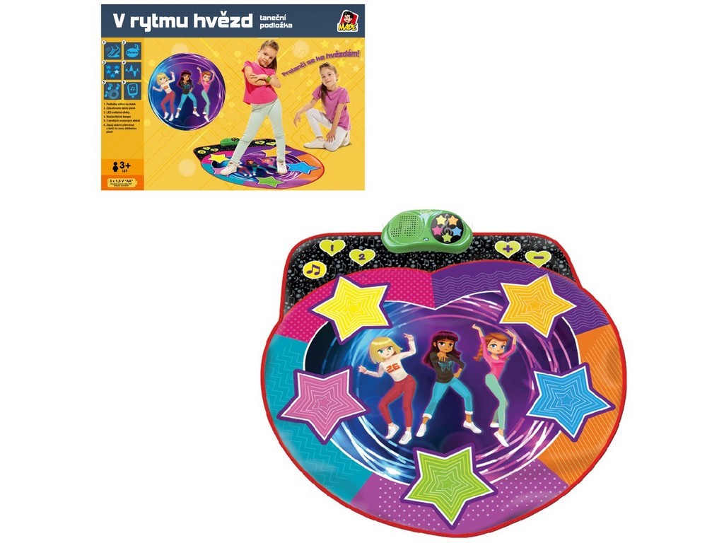Skvělá zábava pro malé a začínající tanečníky je nášlapní taneční podložka. K podložce je možné připojit externí audiozařízení (MP3 přehrávač, CD přehrávač atd.) a tančit tak podle svých oblíbených písniček. Klíčové vlastnosti:Rozměr podložky 90 x 101 cmMožnost připojení externího audio přehrávače3,5mm jack součástí Nastavitelný rytmusDotykové senzory4 zabudované podkladové melodie5 nášlapných senzorů pro aktivaci speciálních zvukových efektůRozměry boxu: 47 x 33 x 7,5 cmNapájení bateriemi 4 x AA 1,5 V (nejsou součástí)Určeno pro děti od 3 let