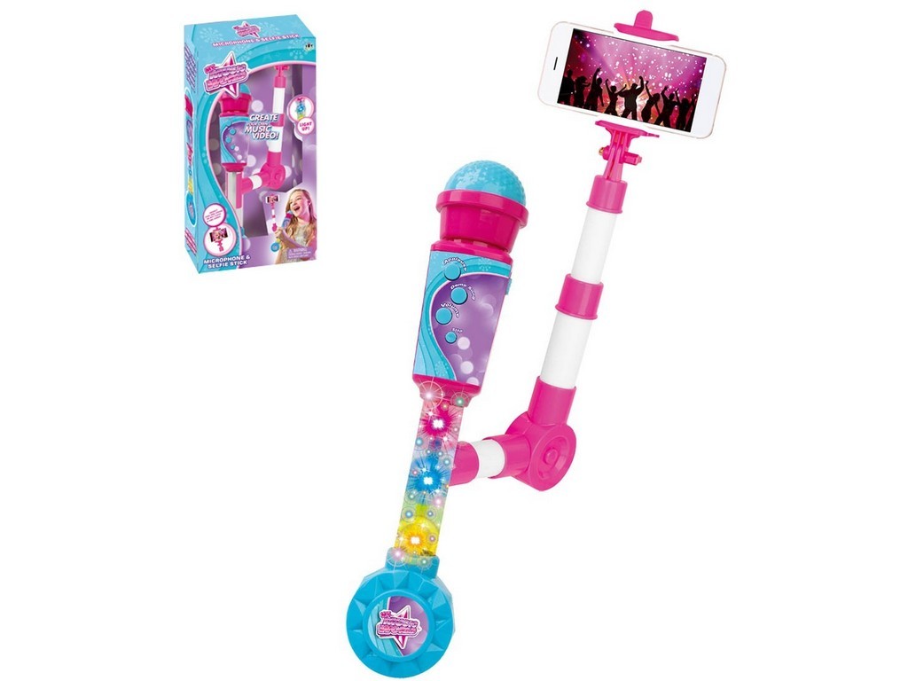 Mikrofon na baterie se světelnými efekty. Je možné připojit externí zařízení (MP3 přehrávač nebo chytrý telefon) a dítě může zpívat se svou oblíbenou hvězdou. Součástí je i selfie tyčka, na kterou je možné připevnit mobilní telefon a při zpívání se i natočit na video. Napájení: 3 x 1,5V (AA) baterie nejsou součástí balení.Rozměr: 28 cm